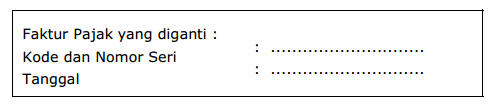 - Pada Faktur Pajak Pengganti sebagaimana dimaksud pada butir 1, dibubuhkan cap yangmencantumkan Kode dan Nomor Seri Faktur Pajak serta tanggal Faktur Pajak yang diganti.Pengusaha Kena Pajak dapat membuat cap tersebut seperti contoh berikut. Kode dan Nomor Seriserta tanggal Faktur Pajak yang diganti dapat diisi dengan cara manual.